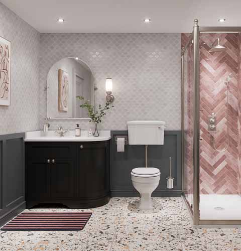 - Low level WC with vanity matched soft close seat by Burlington Guild