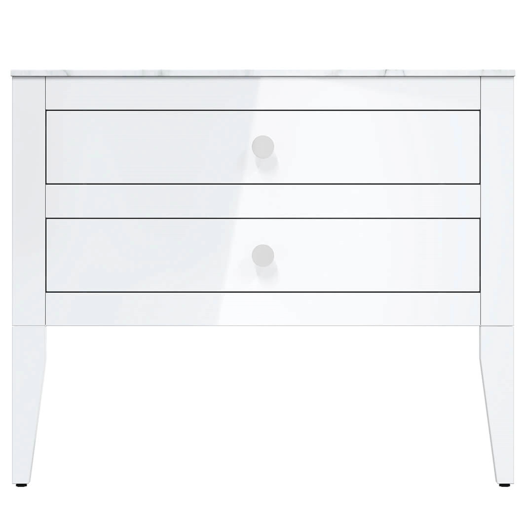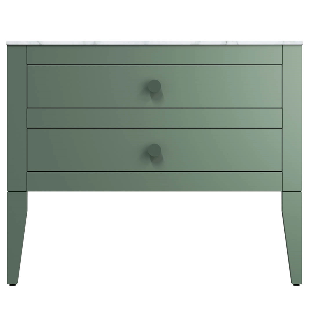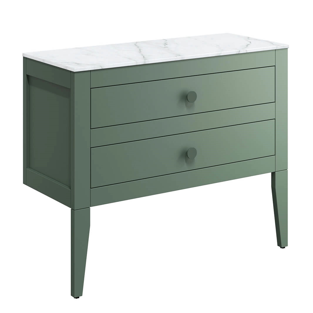 The Crosswater Canvass 900mm two drawer unit with matching decorative legs and Carrara marble effect worktop (when selected). The Canvass vanity unit is available in four finishes, all of which are designed to be visually striking whilst offering high levels of durability with the added benefit of being manufactured from 80% renewable sources.