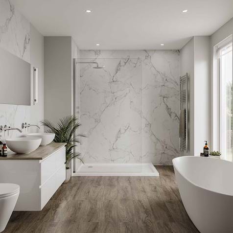 Multipanel ‘Calacatta Marble’ wall panels in your choice of three sizes. These panels are available either unlipped or with Multipanel’s Hydrolock edge detail. Calacatta Marble from the Linda Barker Collection is designed to emulate the look and feel of real slabs of marble, allowing you to achieve a high end design for a fraction of the price of the real thing.